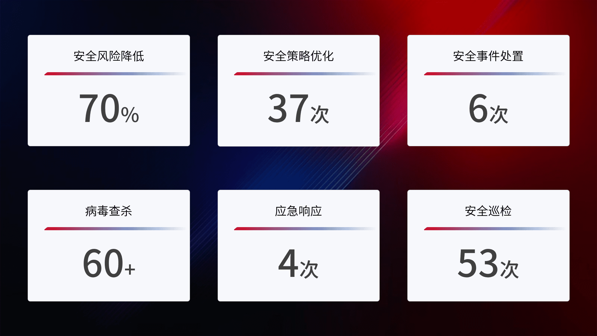 提供全面的安全事件报告体系,,,,包括处置报告、、、周报、、、季度和年度总结,,,,结合持续监控,,,,帮助客户深入了解网络安全状况。。