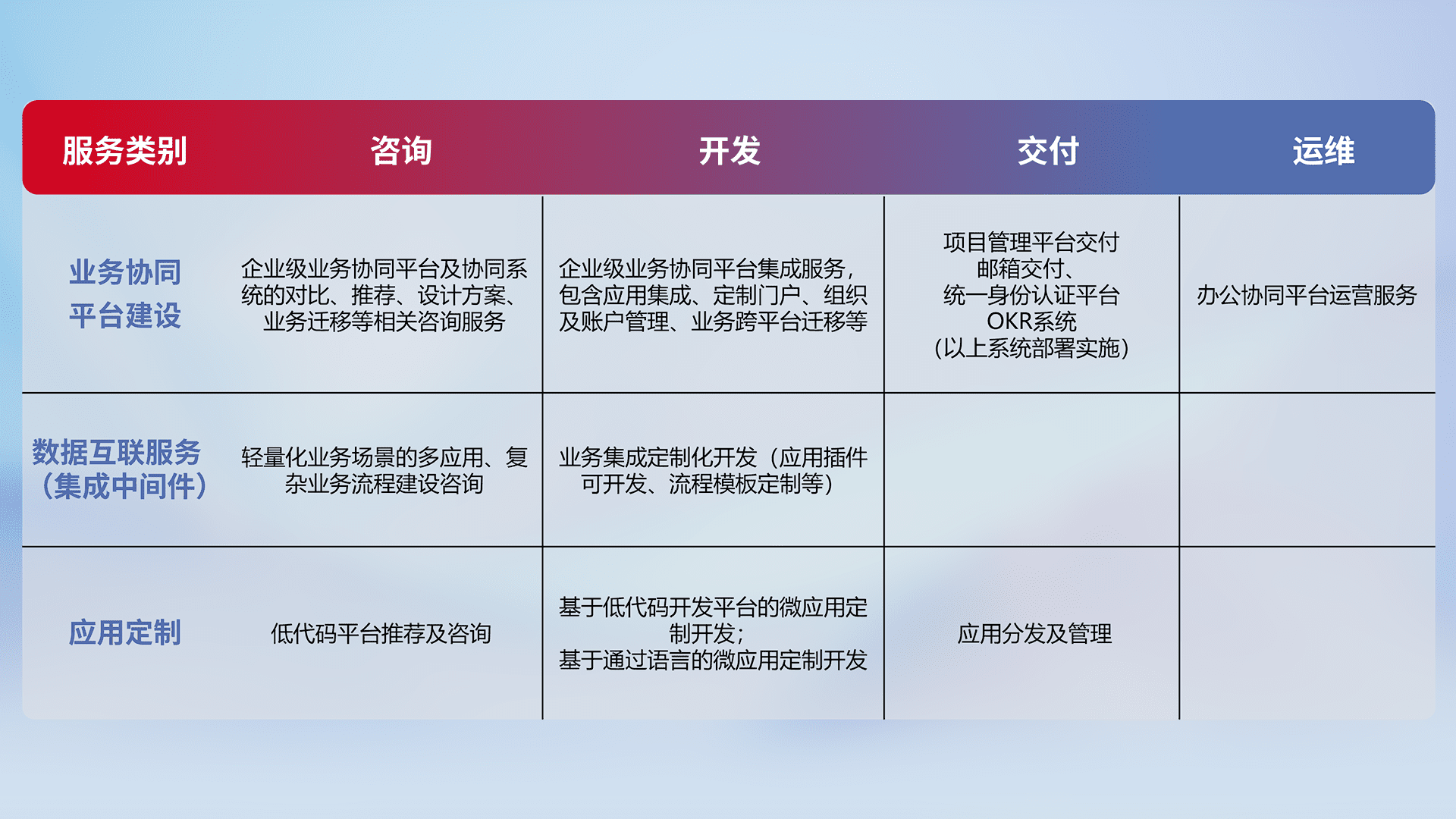 针对钉钉、、、企微、、、IDaas等平台级产品提供产品的规划、、、方案、、、交付、、、、定制化开发等服务,,,实现如统一协同办公、、、、智能客户服务、、、混合会议管理、、、智能数据查询、、、、等业务场景,,,,实现数字化转型。。