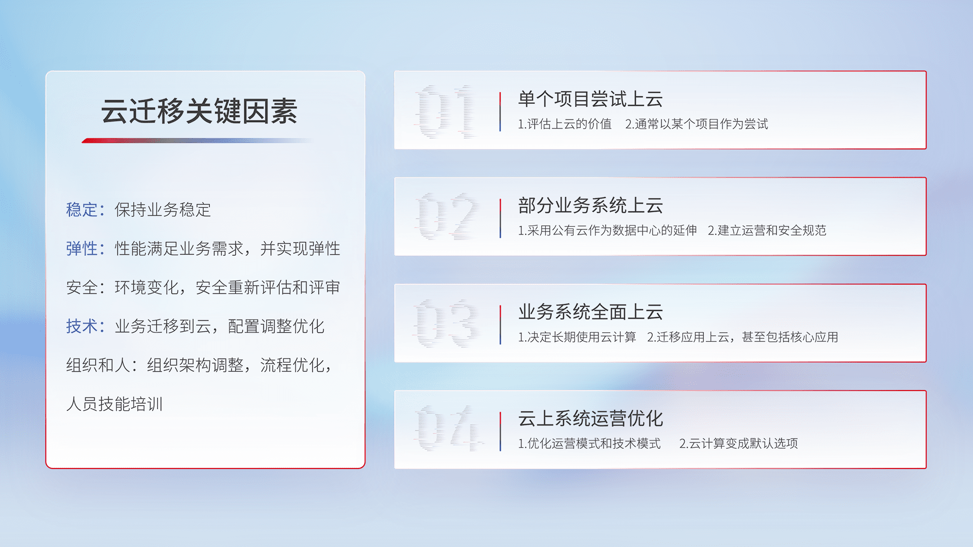 结合实际业务,,从规划设计、、、、云平台选型、、云原生改造、、数据迁移、、集成交付,,,,迁移全过程为客户识别最佳上云路径,,,做好风险识别管理,,设计网络架构、、、、身份权限、、、安全审计合规、、操作审计、、、、日志审计、、、、监控告警策略、、多站点容灾设计等,,,,对云上基础设施进行整体规划,,,,提升IT治理水平,,,以满足弹性、、高可用、、高性能的需求。。。。