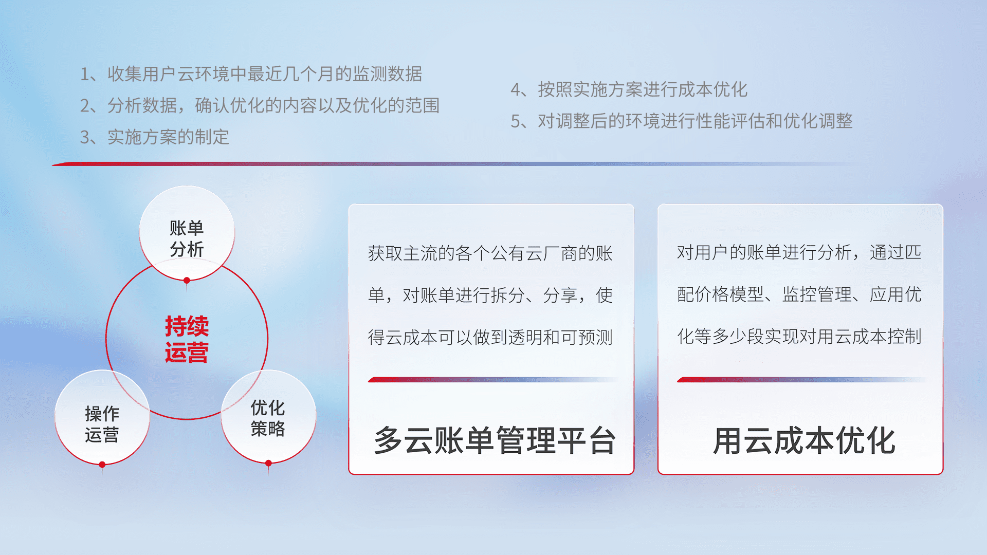 通过多云纳管,,,以统一的资源数据模型把客户的云资源进行抽象和封装,,进而实现对多云资源的统一操作,,,,保障云资源管理的可靠性、、稳定性与可用性。。。。量身定制化运维内容,,配置、、开发运维、、补丁管理、、、、备份、、、、监控、、、认证和访问管理、、、审计和日常巡检等,,,,保障在用云过程中的可靠度,,,,稳定度以及高可用率。。